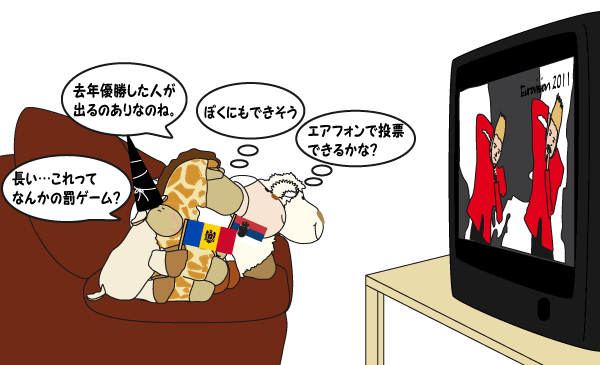 カーニバラスです。ユーロビジョン・ソング・コンテストをみたよ。ぼくたち4人以外はつまんないってオープニング見たらさっさと寝ちゃった。放送時間が長くて遅いね。今年の優勝はアゼルバイジャン。あれ、アゼルバイジャンってヨーロッパだったっけ?音程が外れてたけど、ありなんだ。ちなみにカーニバラスのお気に入りはモルドバ。90年代初期のレッチリが好きなら試してみて。別窓オープン。